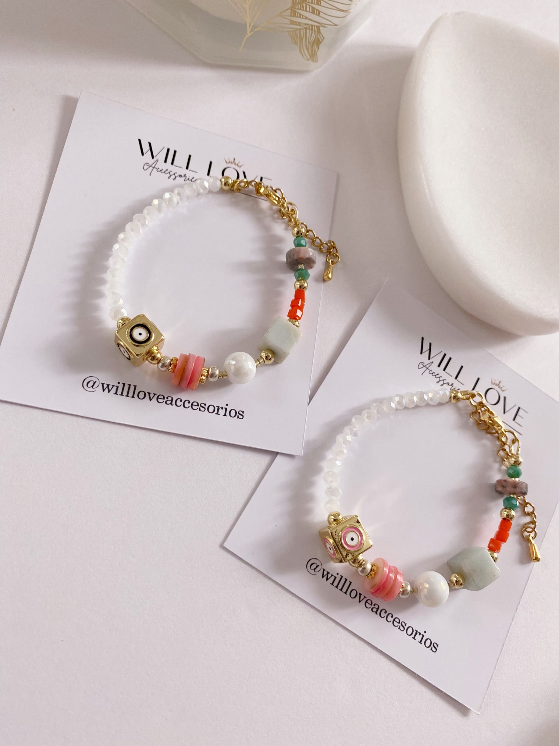 Pulsera ajustable en cuentas y apliques en gold plated 18k (el color del ojo puede variar )
