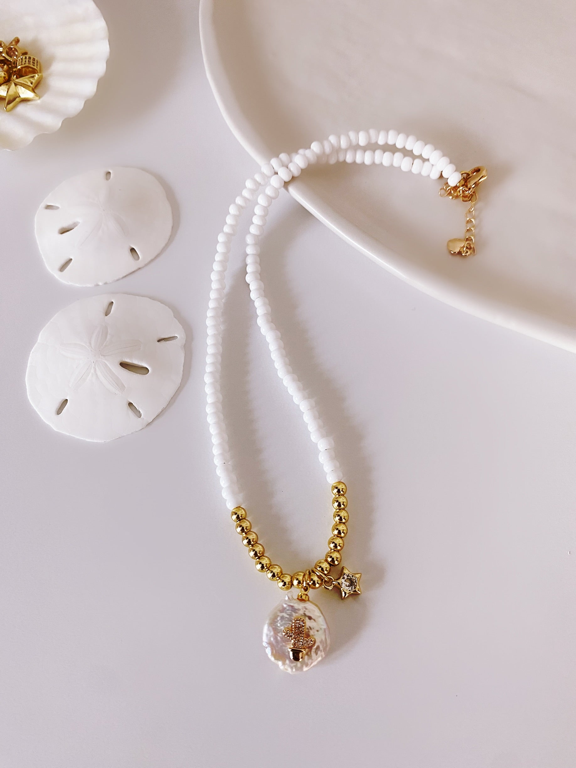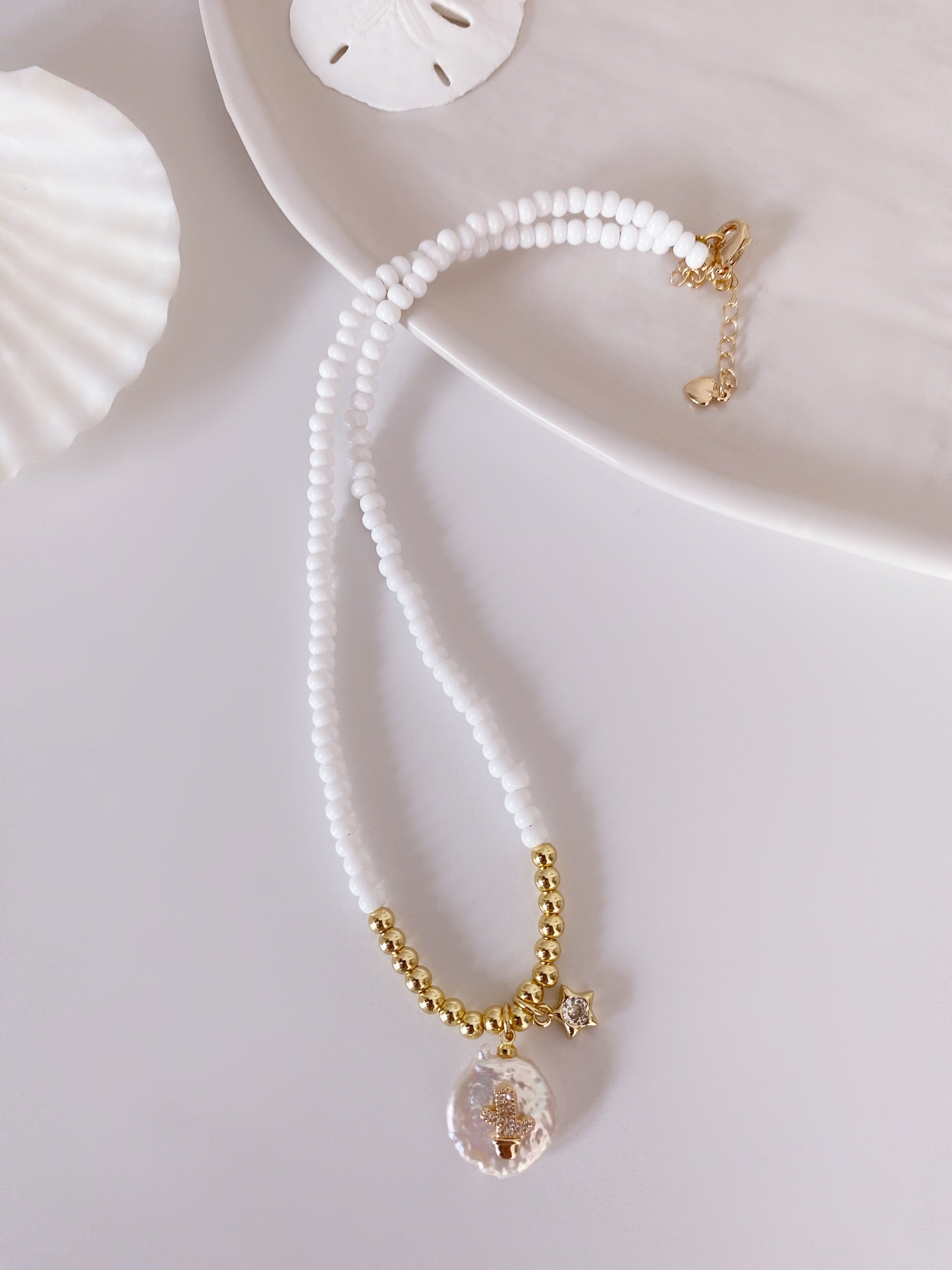 Collar tipo shoker en cuentas de cristal checo color blanco , sharms chapados en oro 18 k en Perla nacarada ✨✨✨