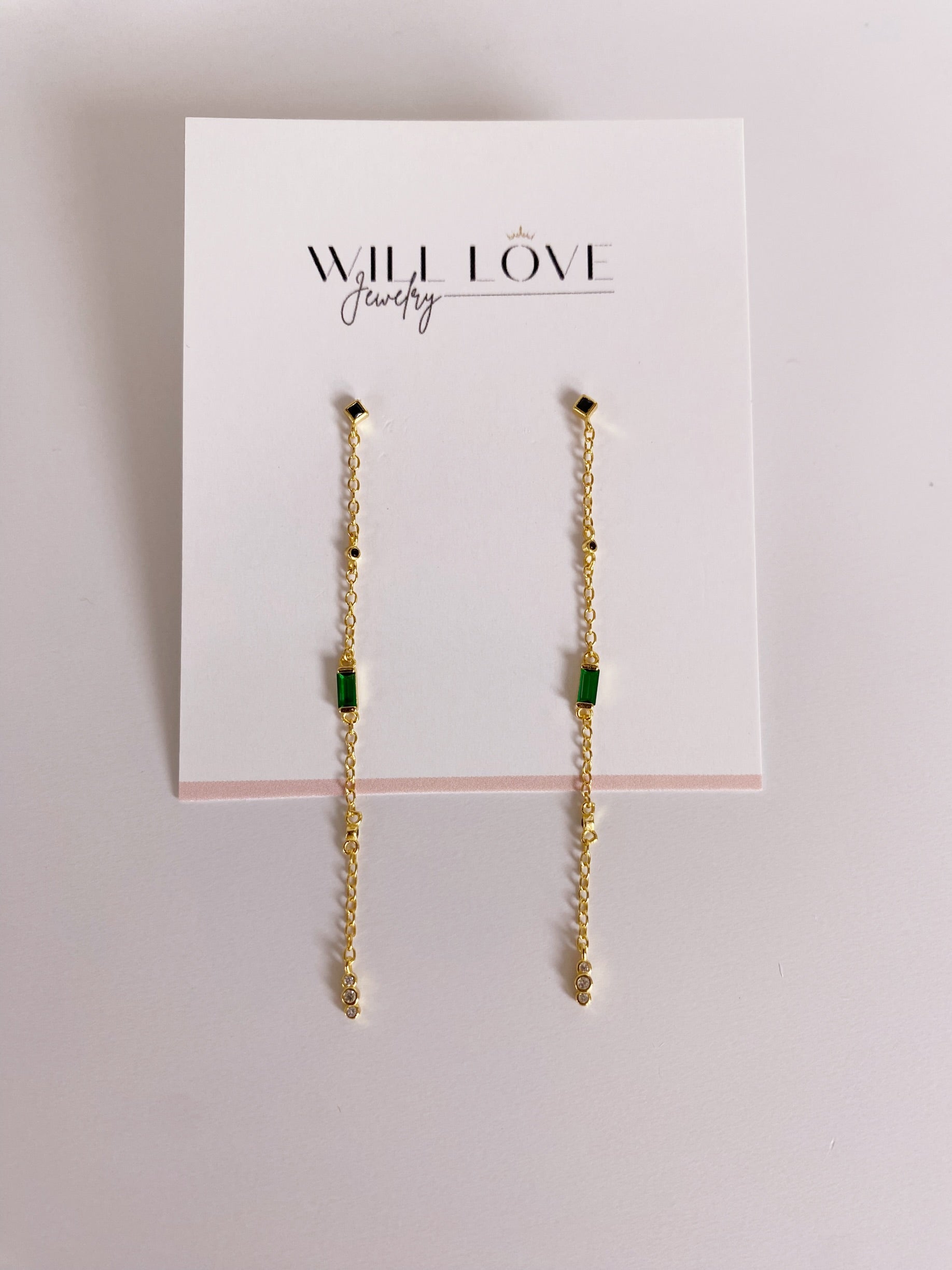 Delicate and timeless, these 925 sterling silver earrings feature a fine gold-plated chain with an elegant emerald-green accent and subtle crystal drops. Perfect for adding a refined touch to your everyday or evening look.