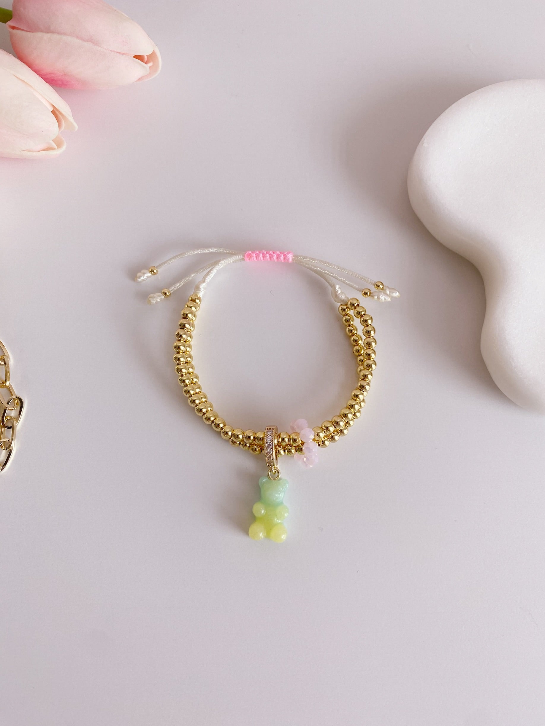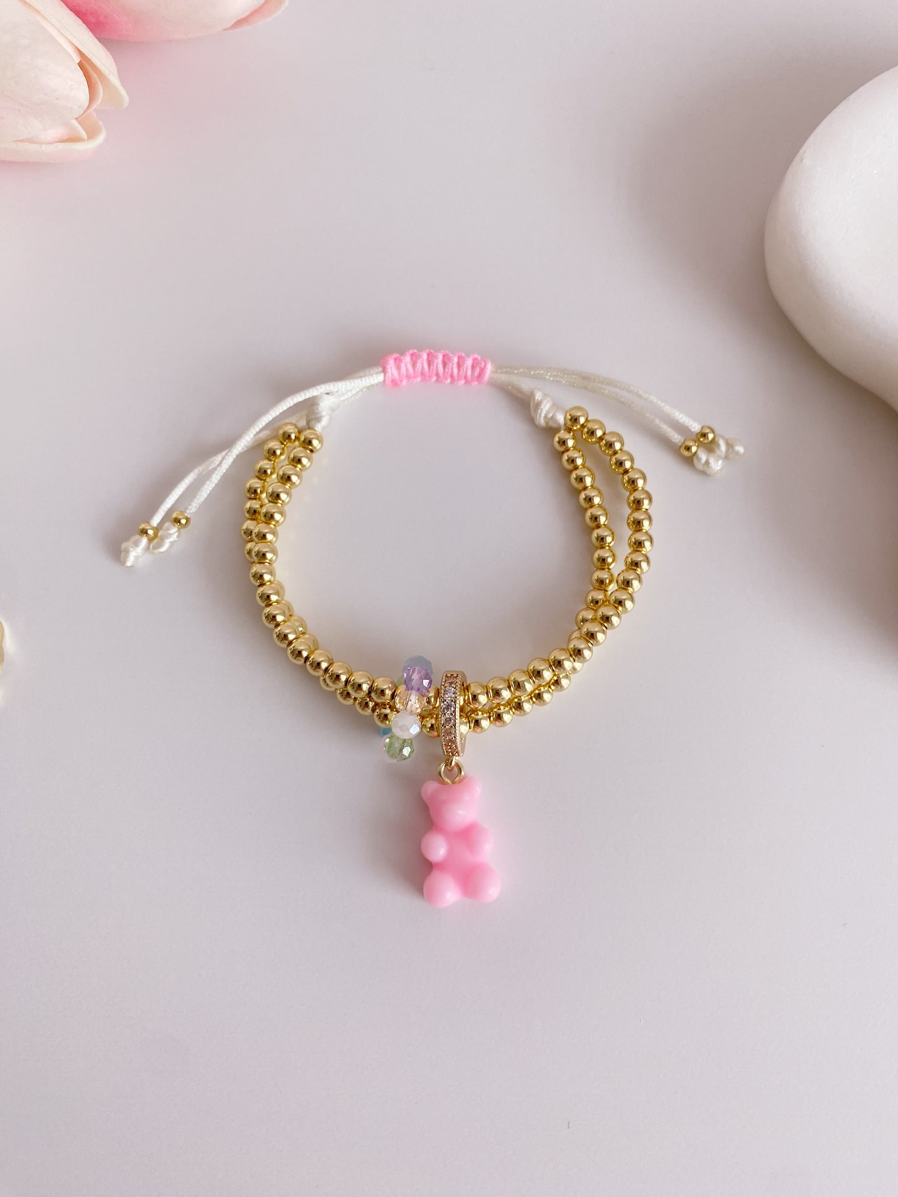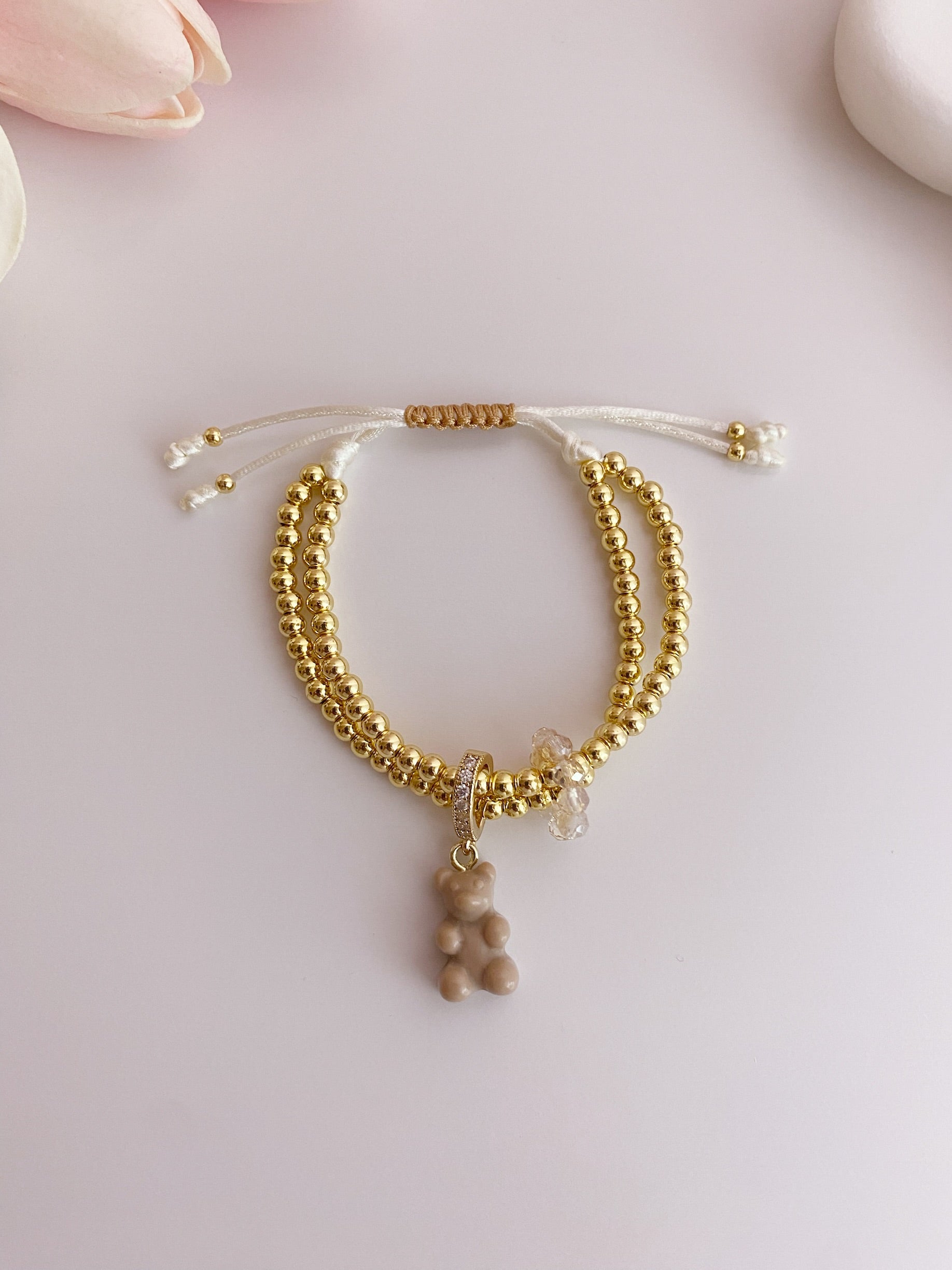 Pulsera ajustable en balinés de rodio chapados en oro de 18 k . Pendiente de osito de resina