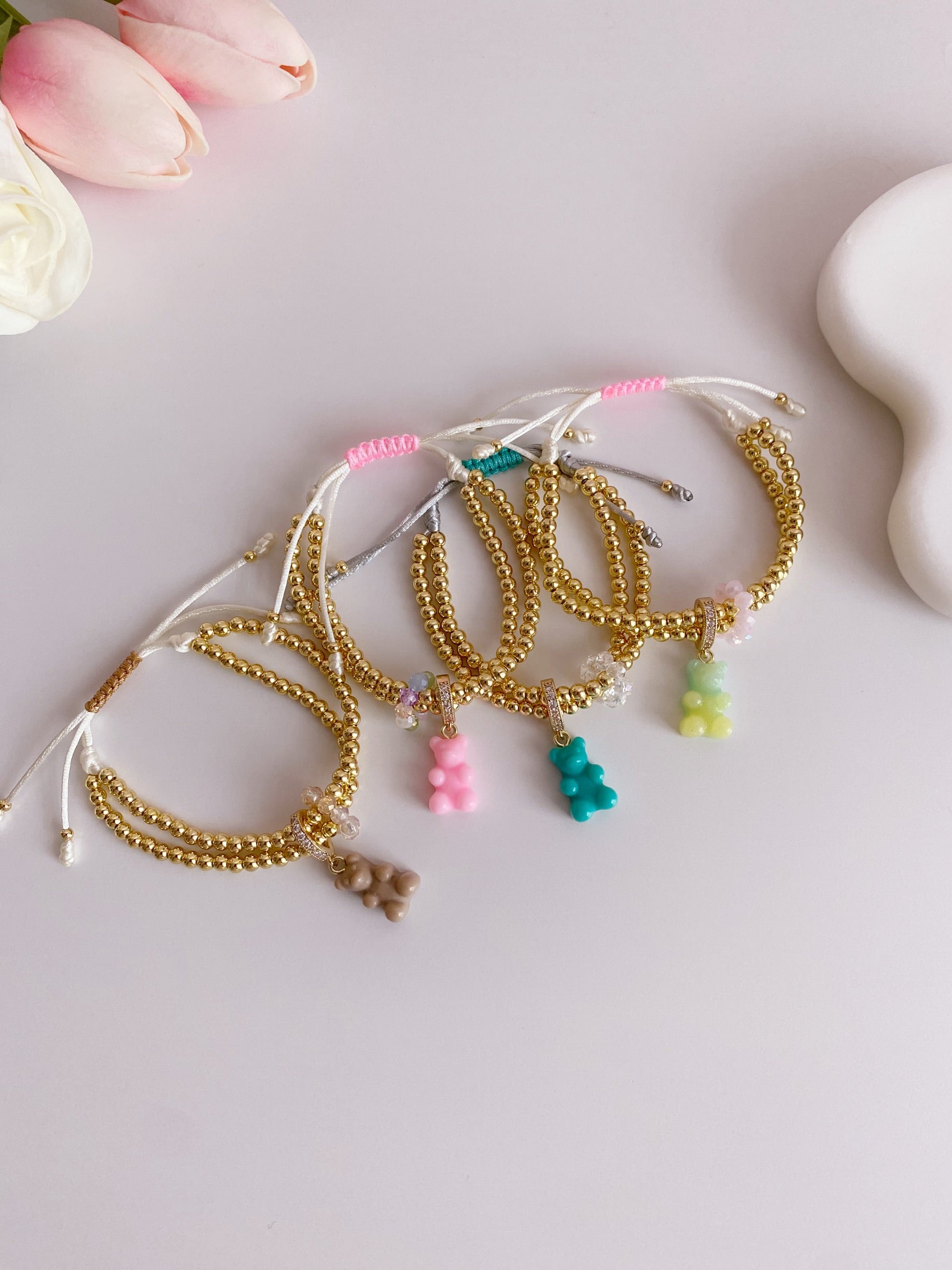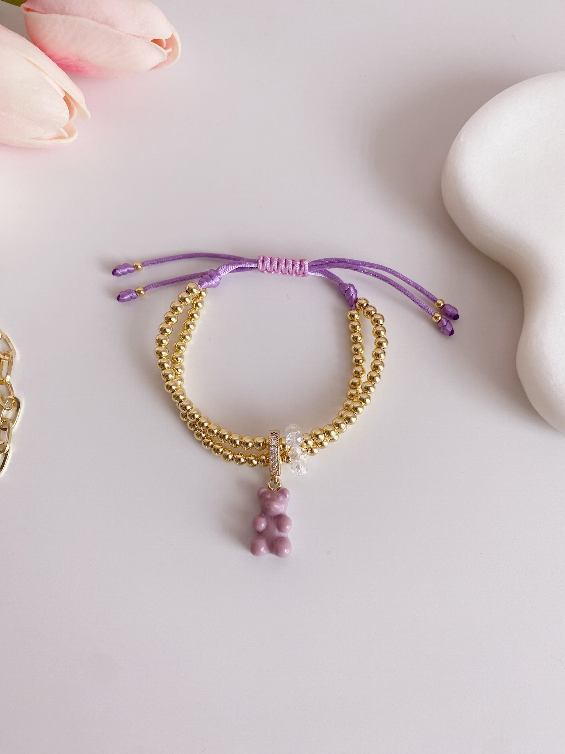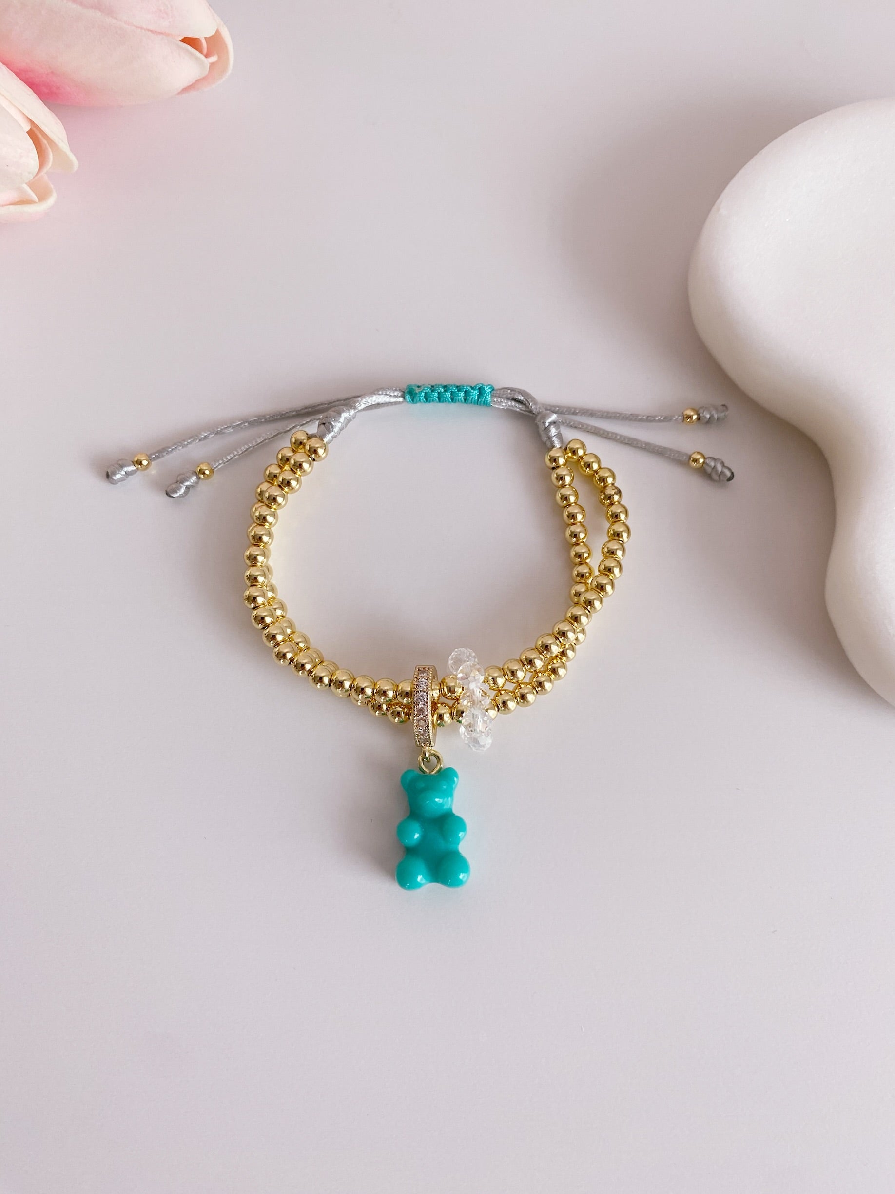 Pulsera ajustable en balinés de rodio chapados en oro de 18 k . Pendiente de osito de resina