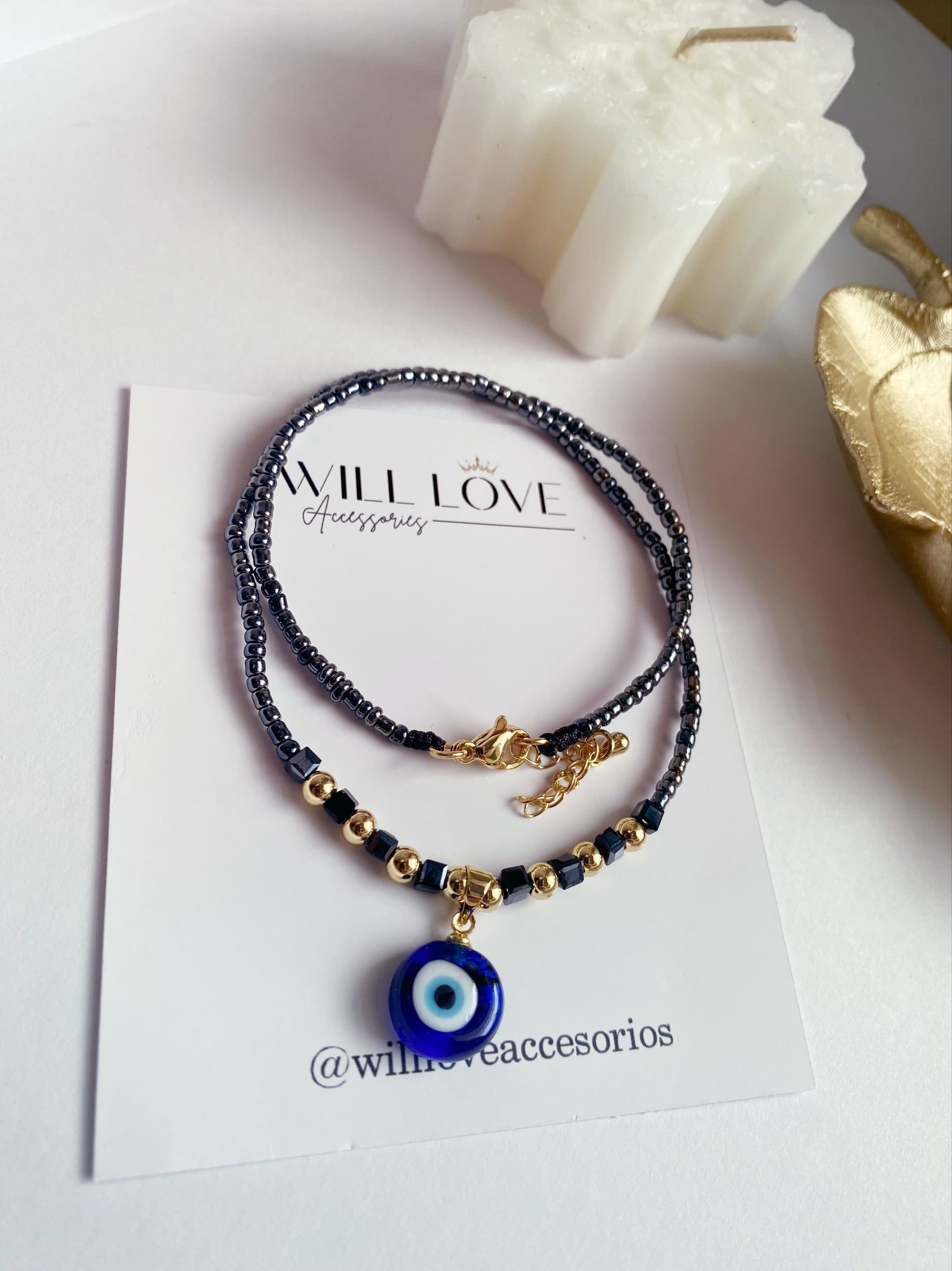 Collar ajustable en cuentas con dije de ojo turco en cristal