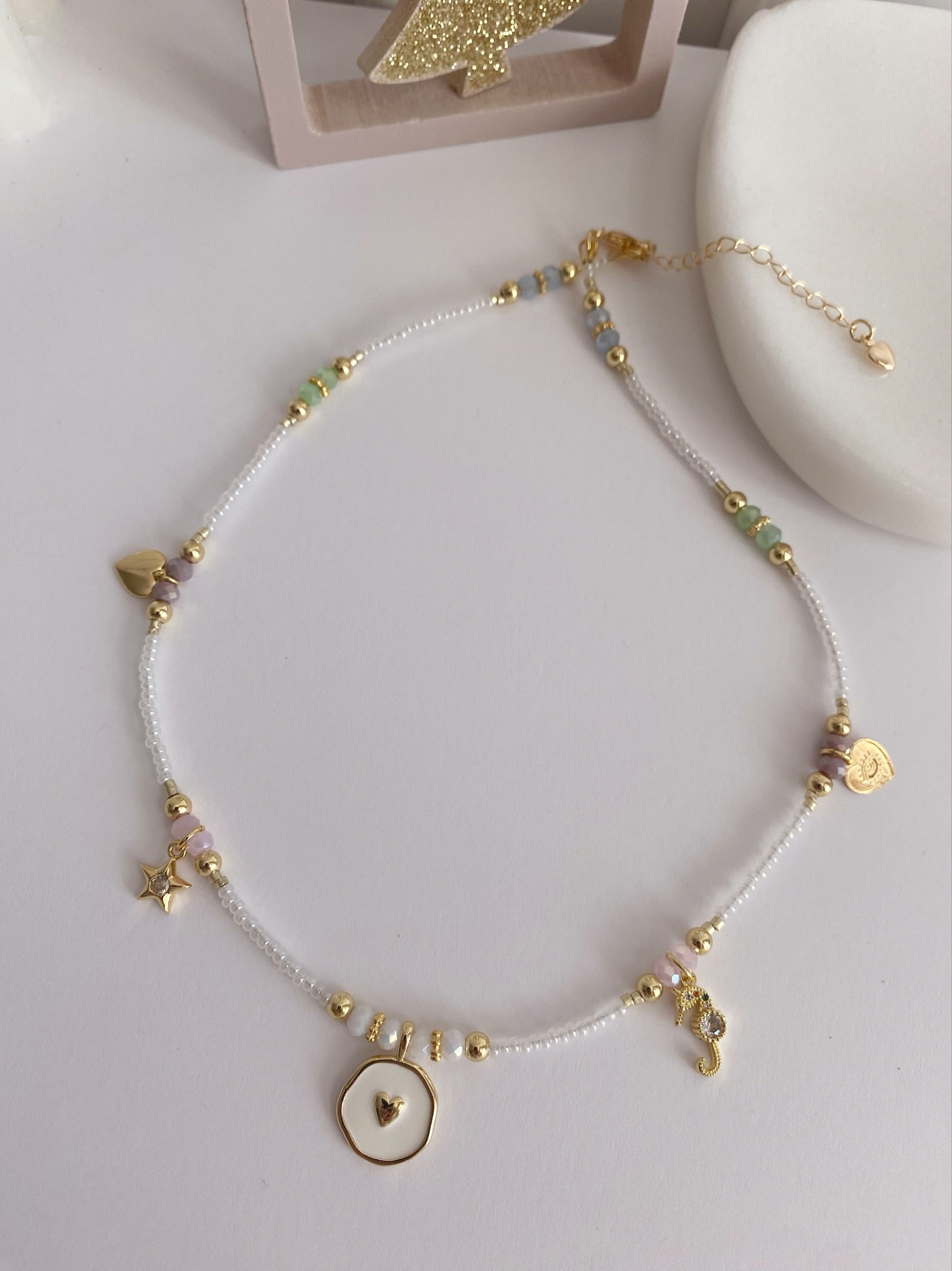 collar ajustable en cuentas de cristal checo con apliques en gold plated 18k