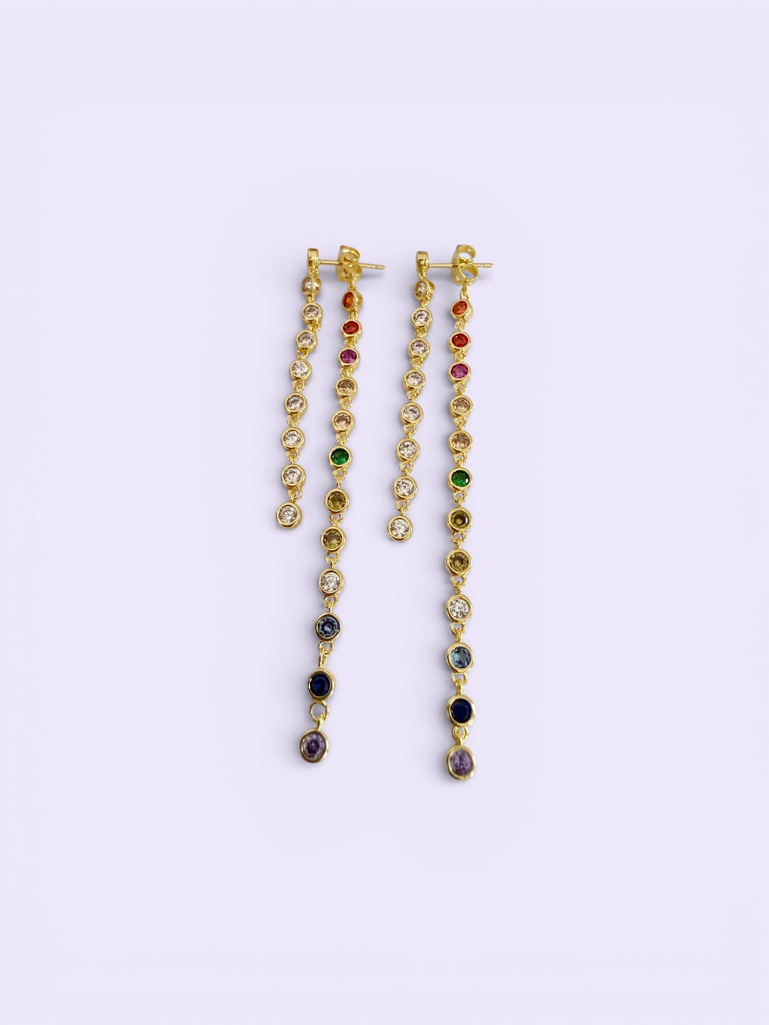 Diseñados en 14K gold plated (chapado en oro de 14 quilates), presentan una delicada cascada de cristales multicolor cuidadosamente engastados sobre base dorada. Cada piedra refleja tonos vibrantes que aportan brillo, elegancia y personalidad.