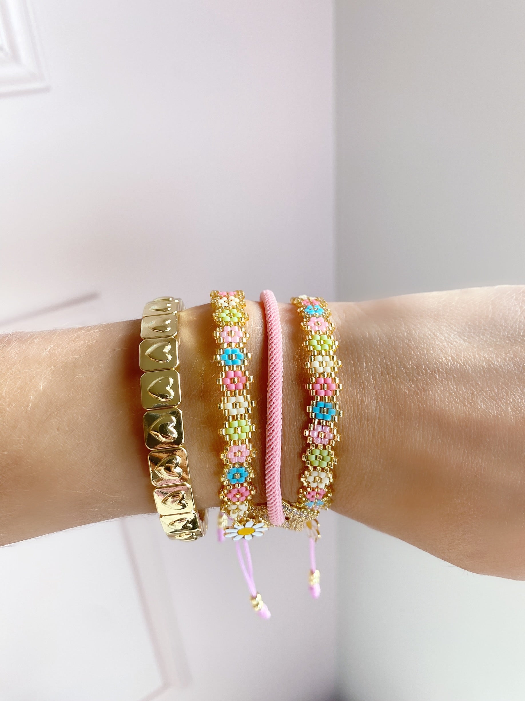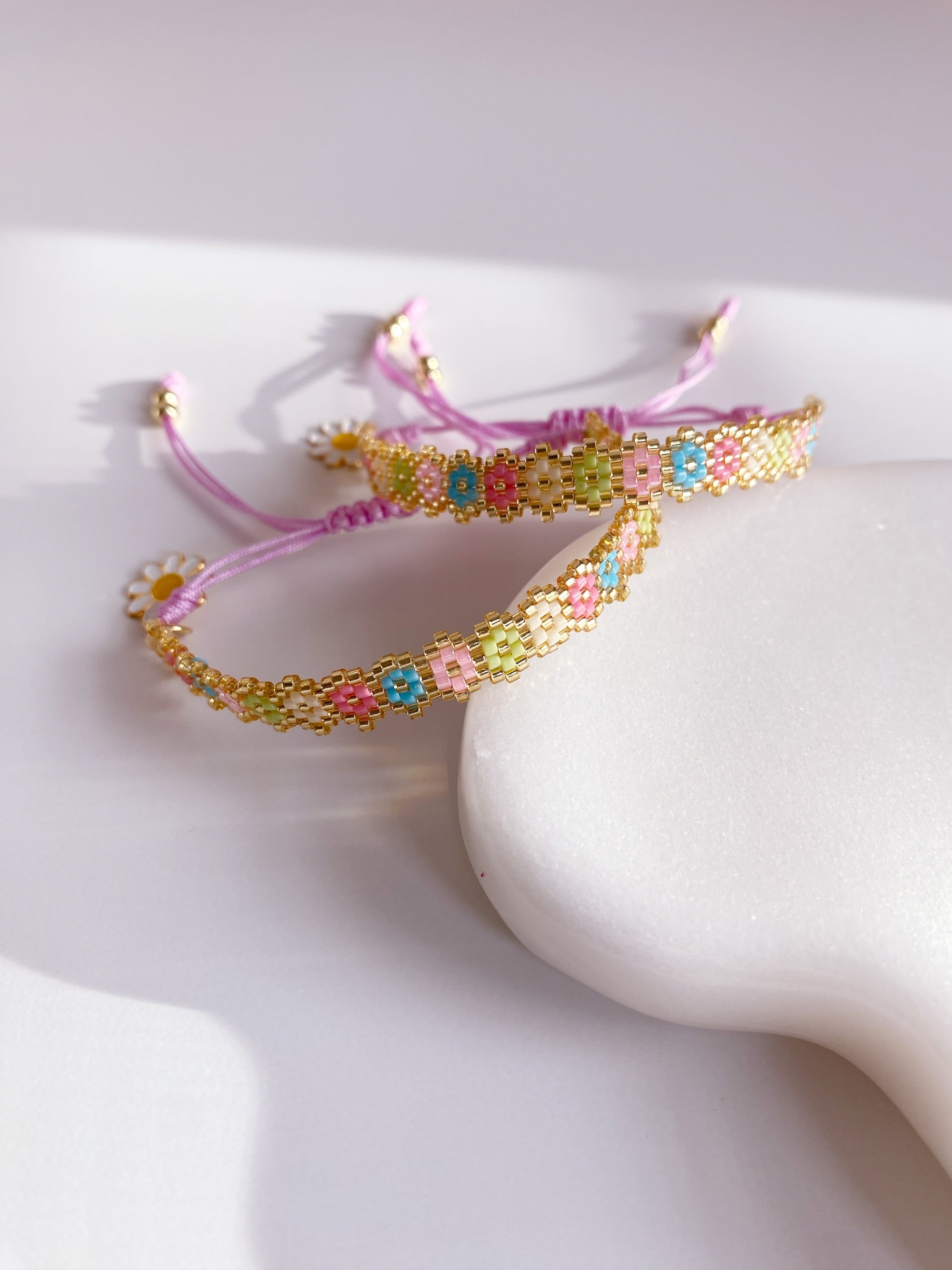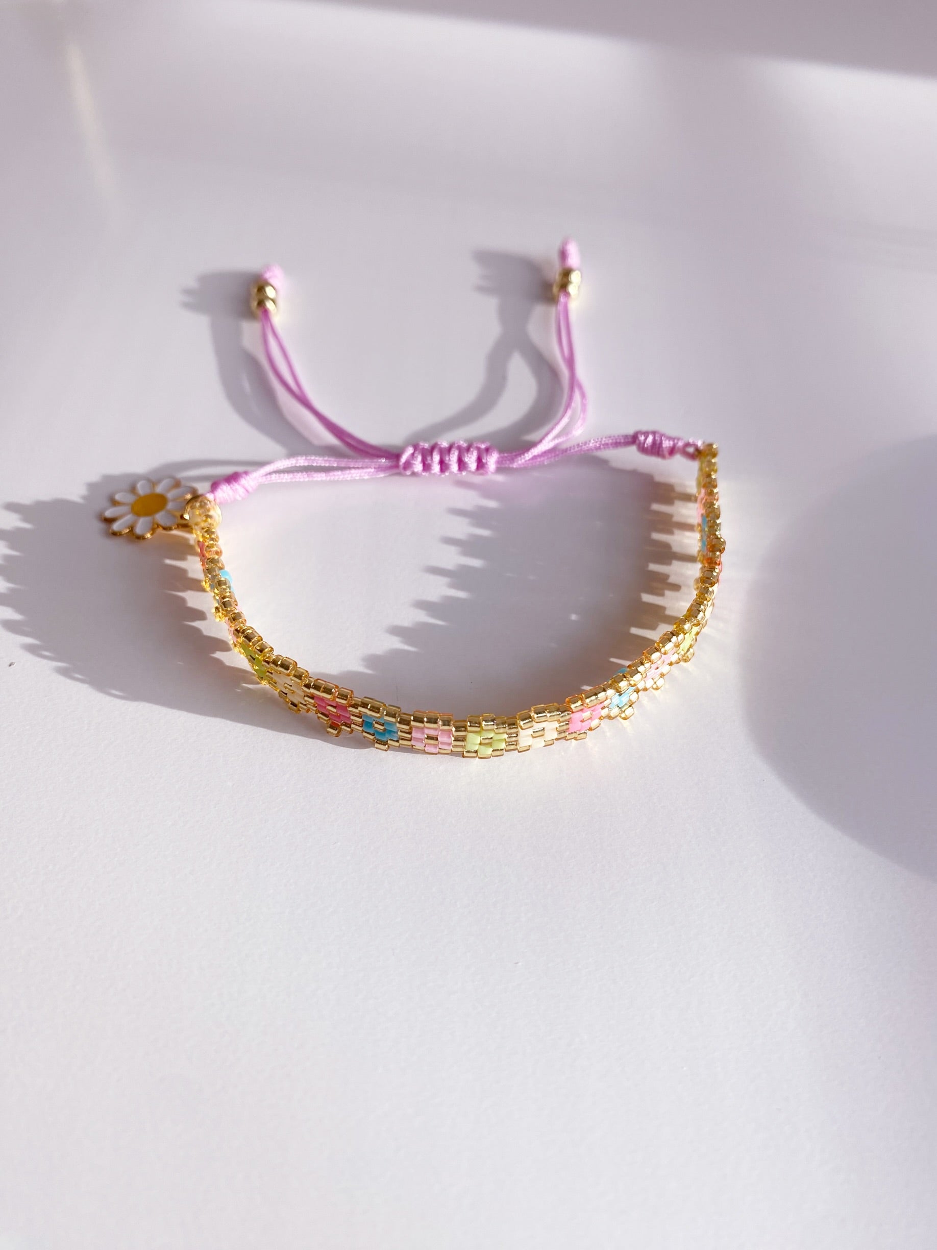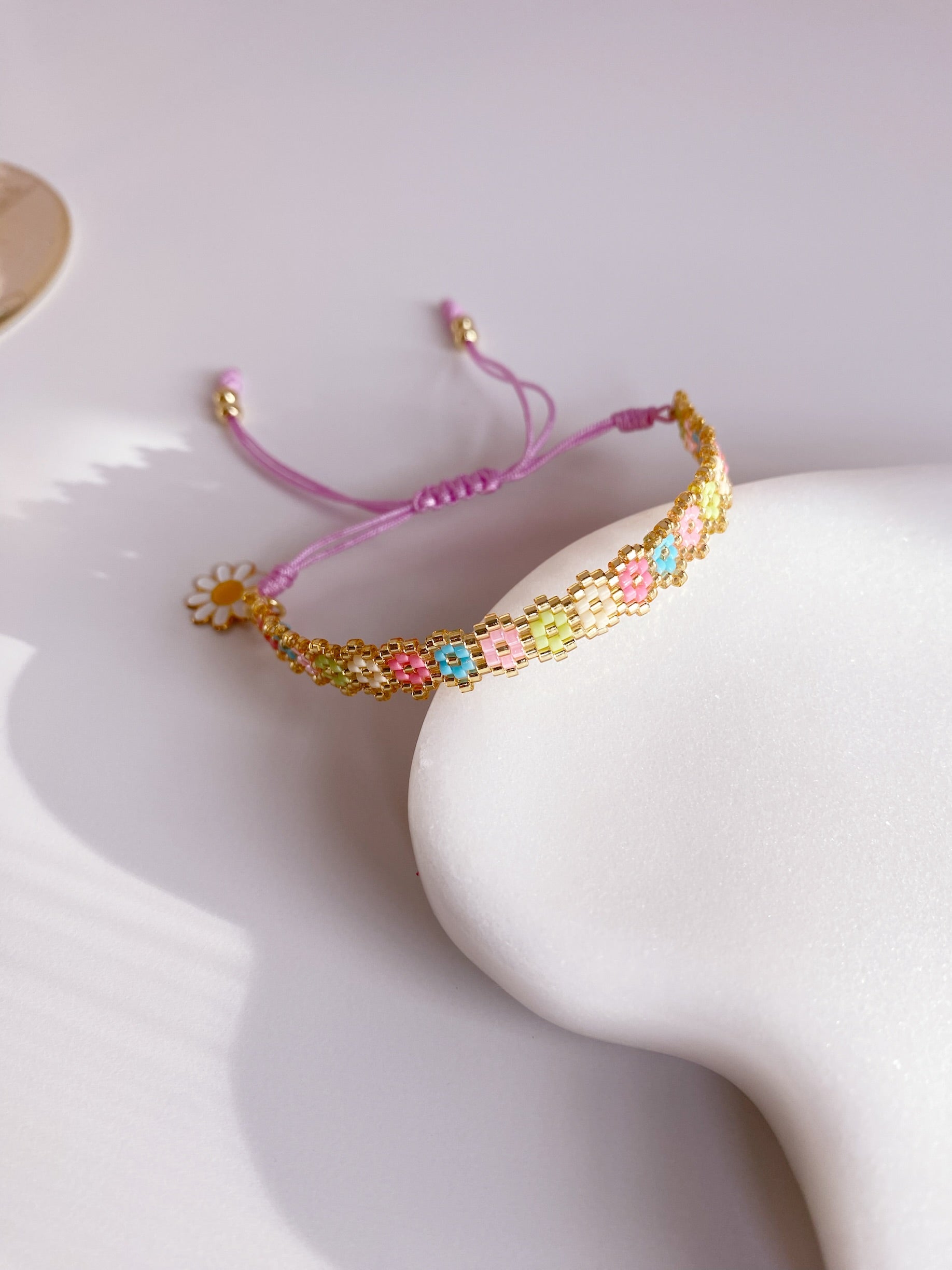 Pulsera tejido a mano en miyuki , diseño de flores en colores pasteles con hilo ajustable .